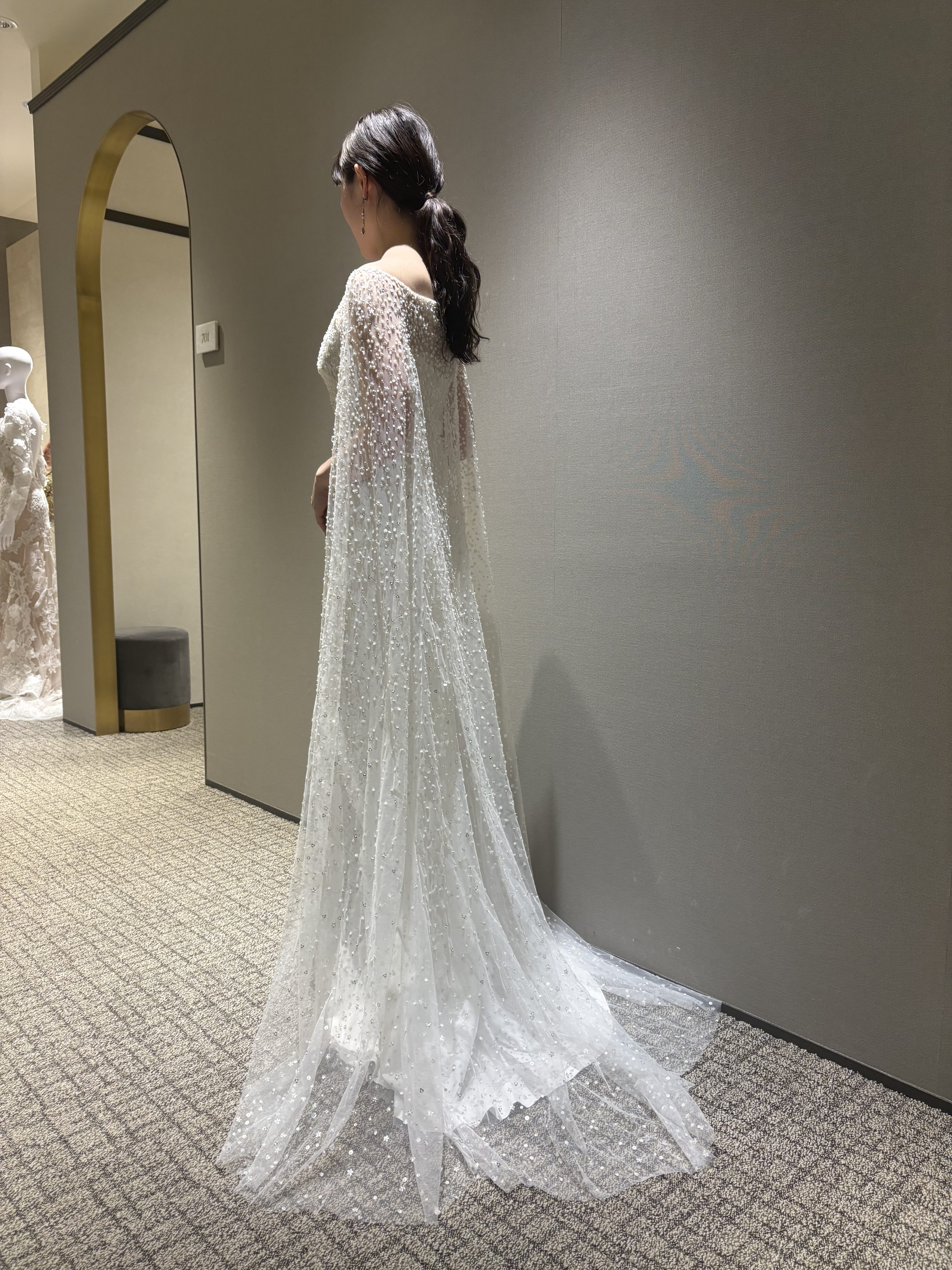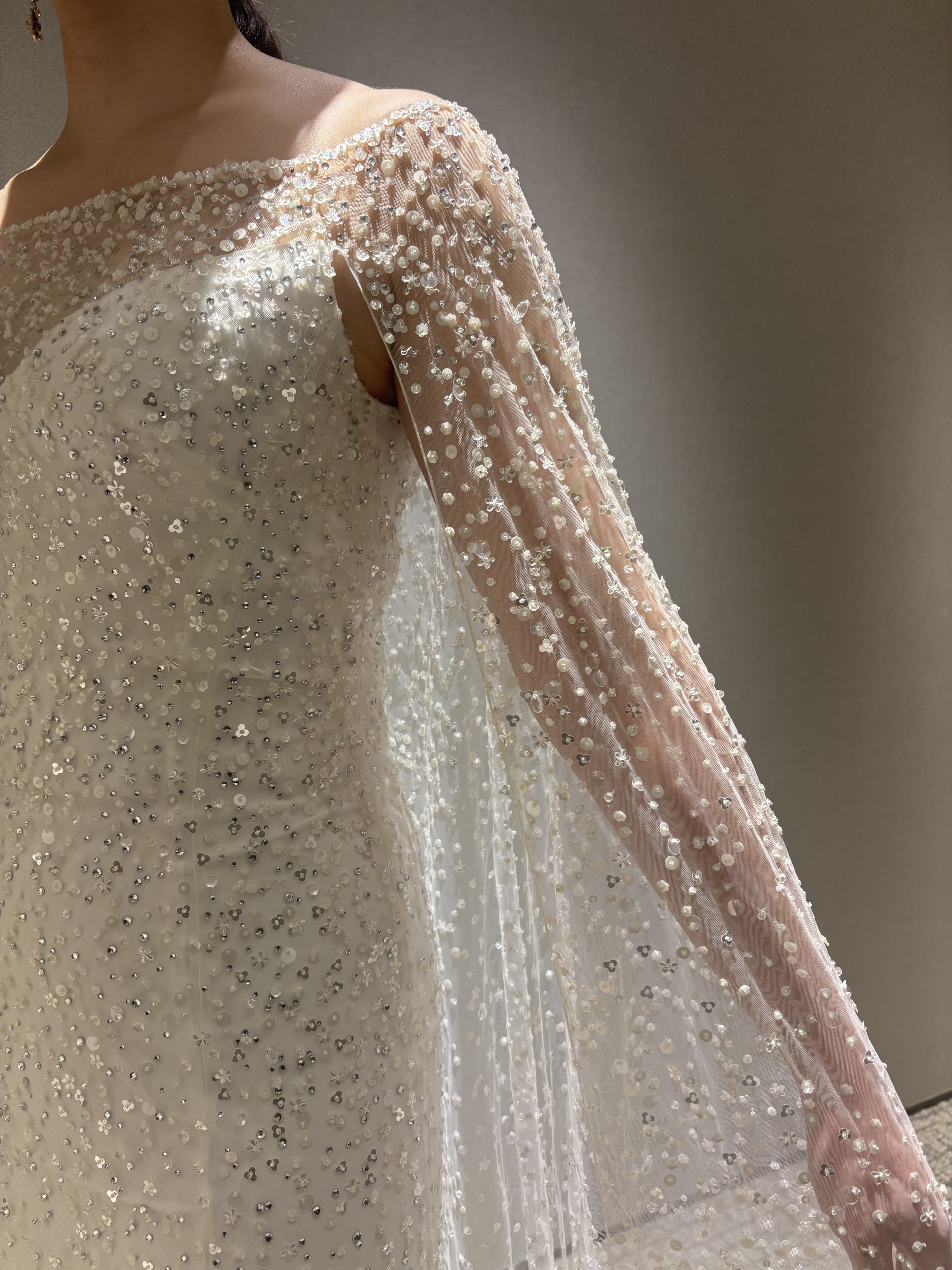 ケープのように広がるスリーブが動きに合わせて揺れ、ドレスが放つ光の粒がよりいっそう際立ちます。