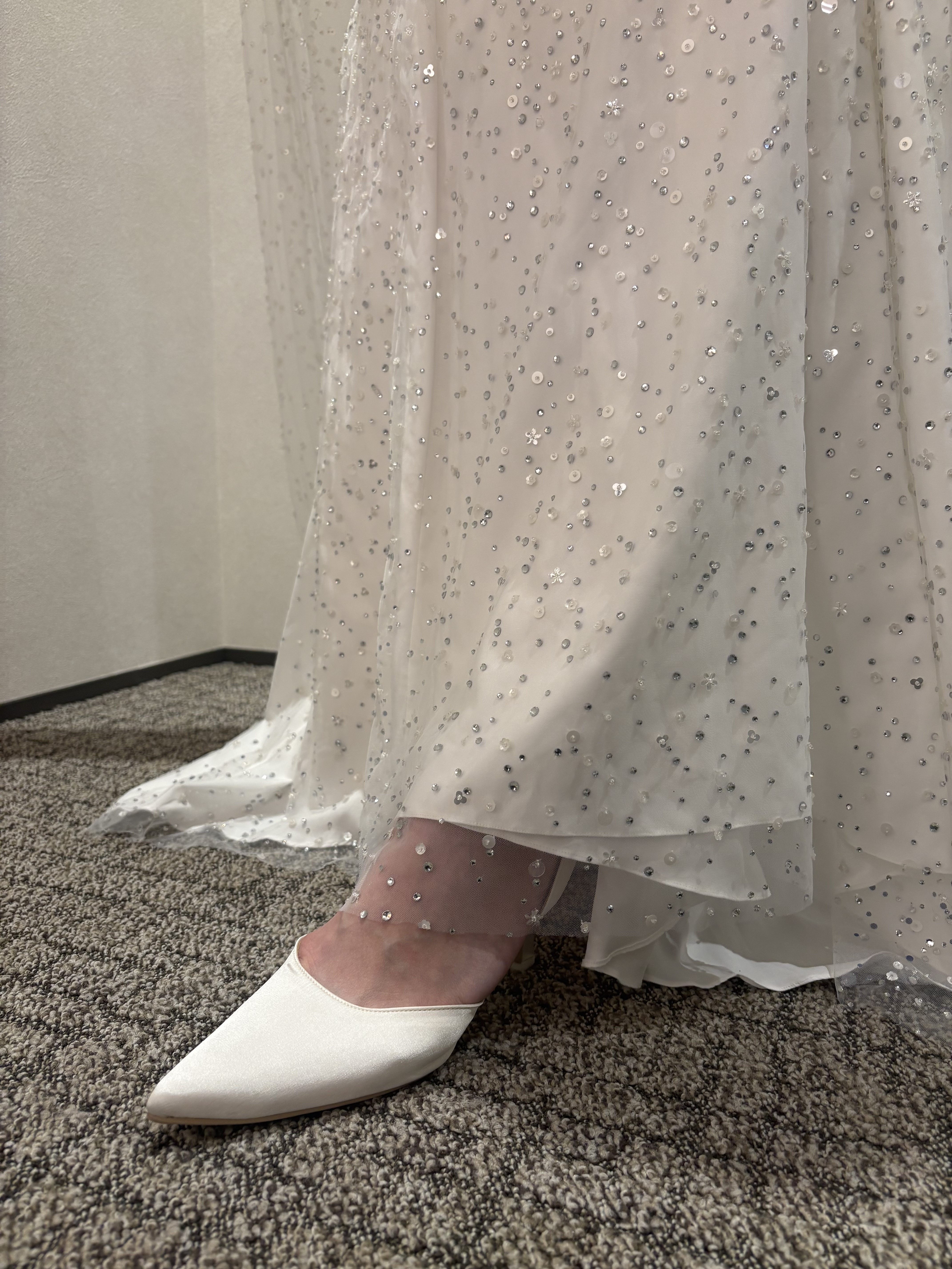 歩くたびにドレスの輝きとサテンの艶感が共鳴し、エレガントな雰囲気をさらに高めてくれるアイテムです。