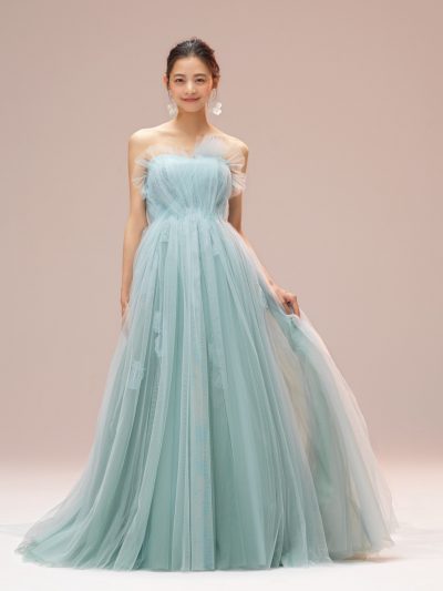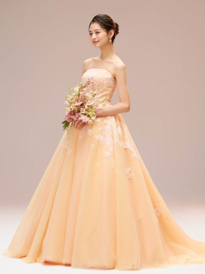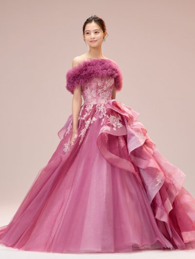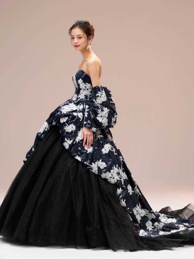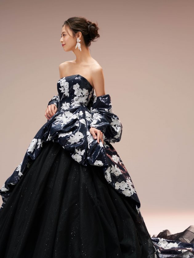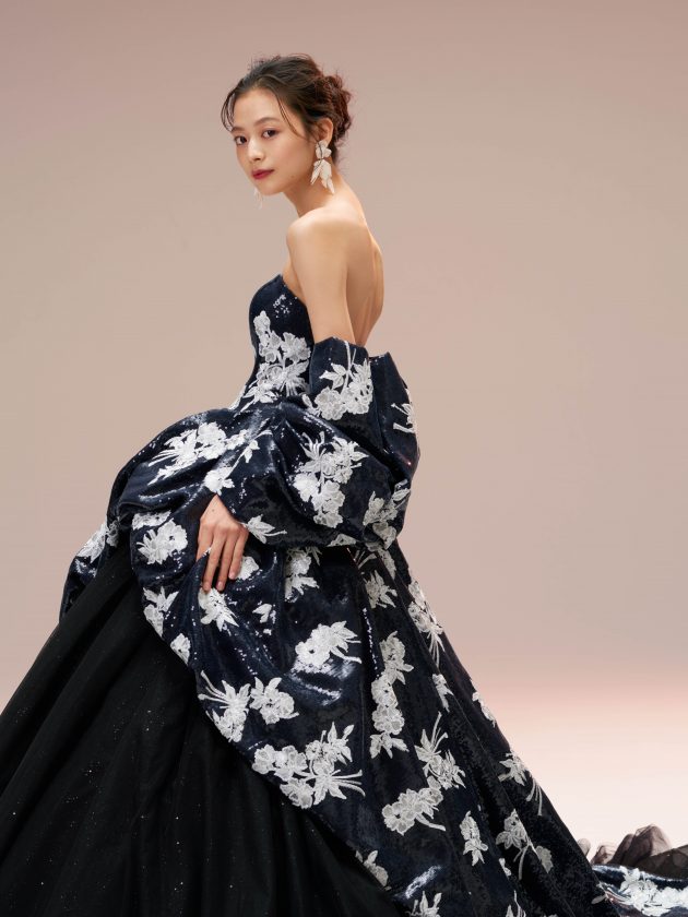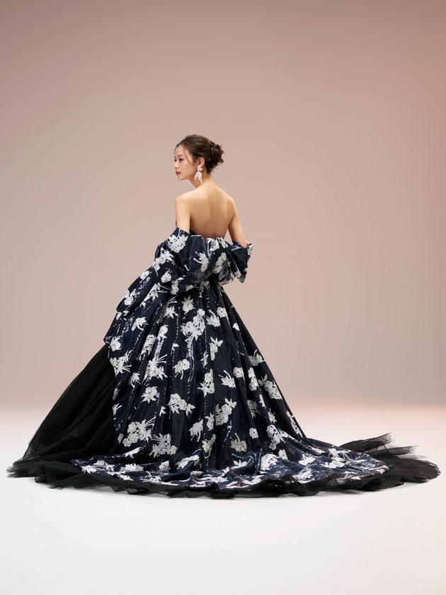 リネンにスパンコール刺繍を全面に施した、スペイン製の生地をたっぷりと使用したラグジュアリーな一着。 インパクトのあるデザインながら、品のよさを感じさせるのは上質な素材にこだわっているからこそ。 内側からブラックチュールが覗くアシメトリーなデザインが、見る角度によって表情を変えて楽しませます。 大きいなバックリボンには袖を通すことができるデザインが花嫁様の個性を引き立たせます。 ※色違いのご用意もあります
