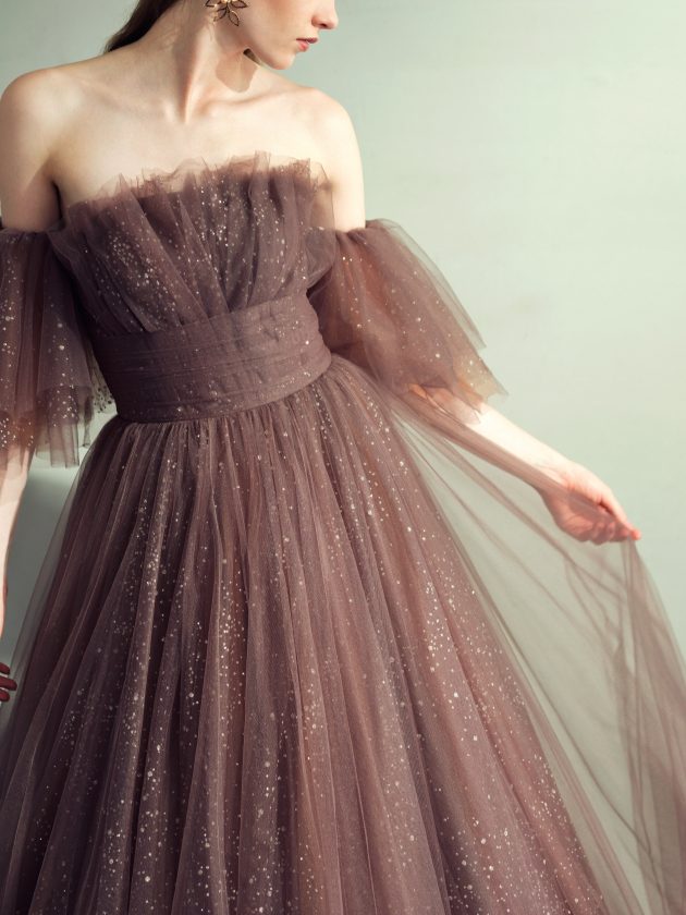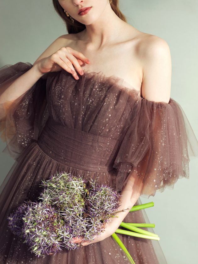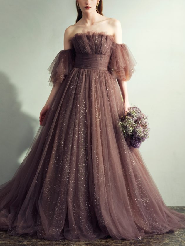 大きめのラメを散りばめたチュールが、華やかな印象を与えます。 軽やかな素材ながらも、ホテルなどの広い会場でもしっかりと映えるボリューム感を実現しました。 コンパクトなビスチェとボリュームたっぷりのスカートの対比が、スタイルを美しく引き立ててくれます。 トレンドのふわふわスリーブは取り外し可能な2way仕様で、お好みのスタイリングをお楽しみいただけます。