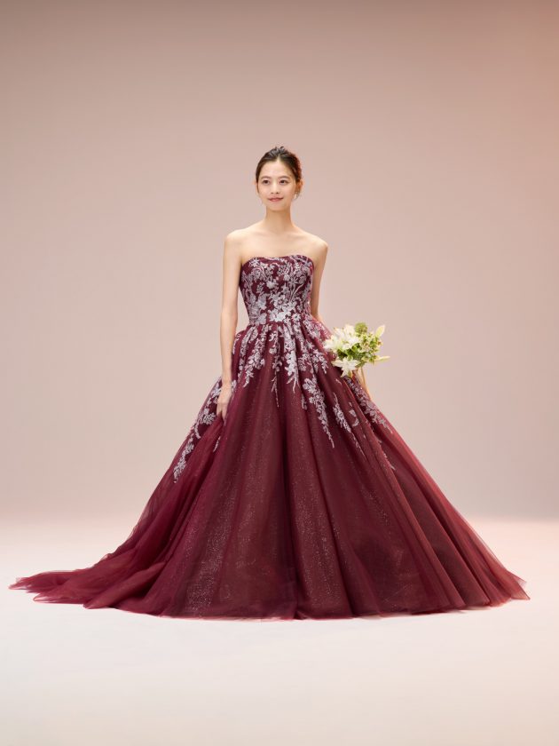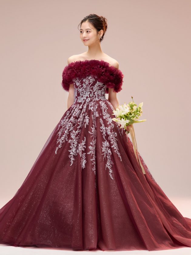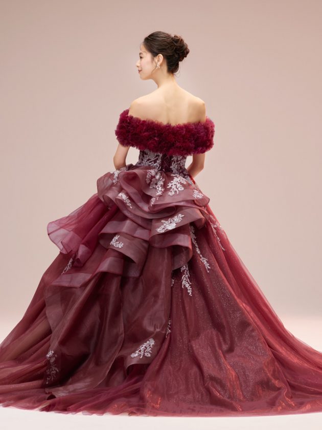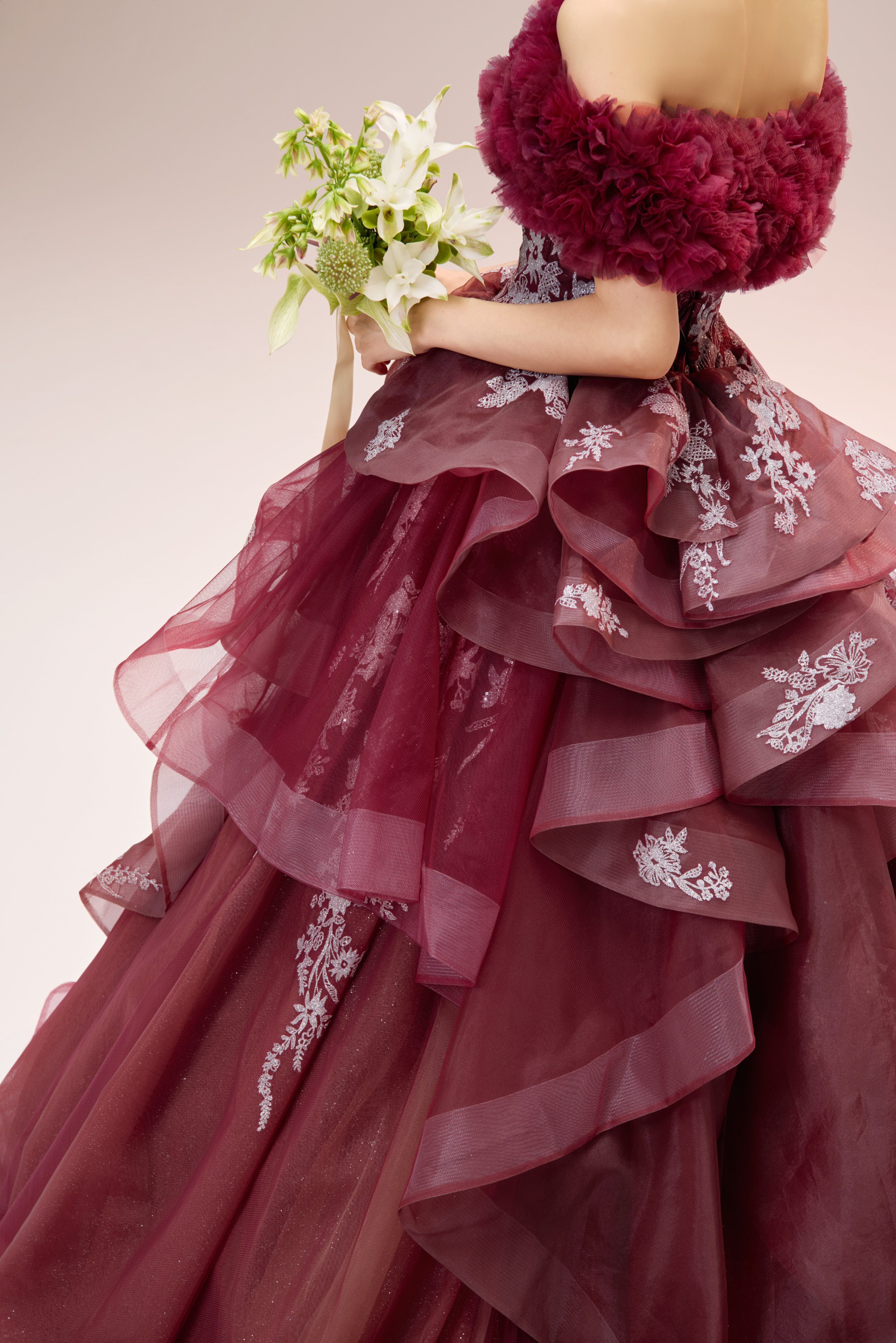 オーガンジーとチュールの2つのファブリックを使ったショルダーパーツ、3色の異なるチュールを重ねることでグラデーションになり、動くたびに様々な表情が見えるカラードレスです。 スカートの裾には施されたホースヘアで立体的で美しいシルエットが叶う1着です。
