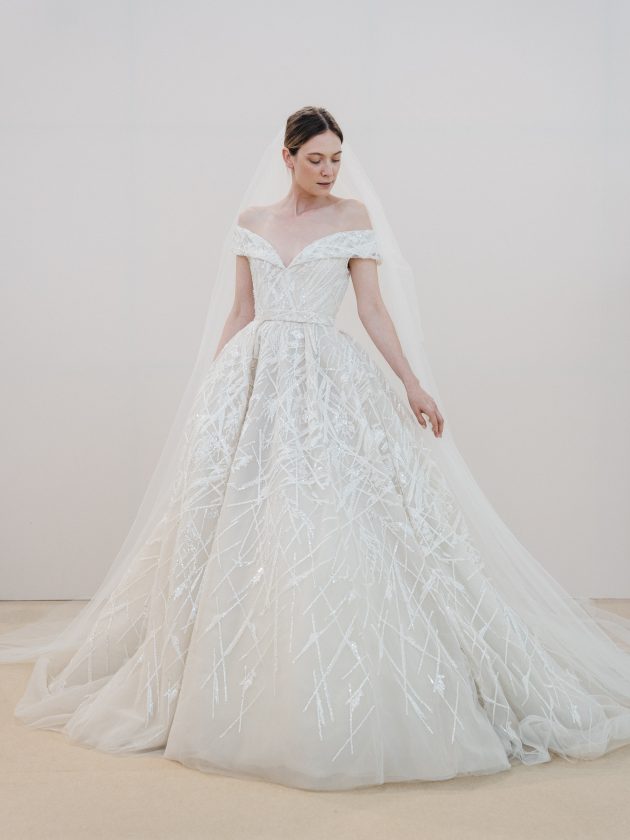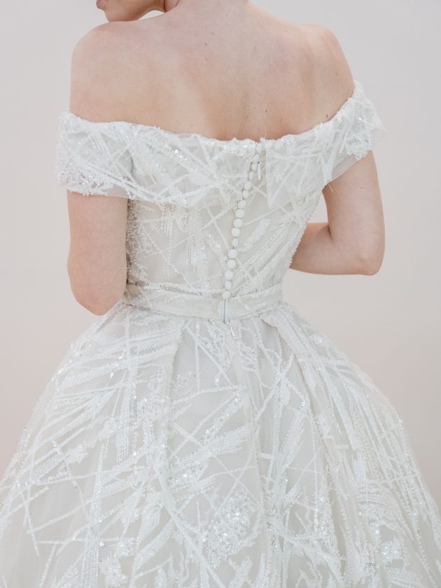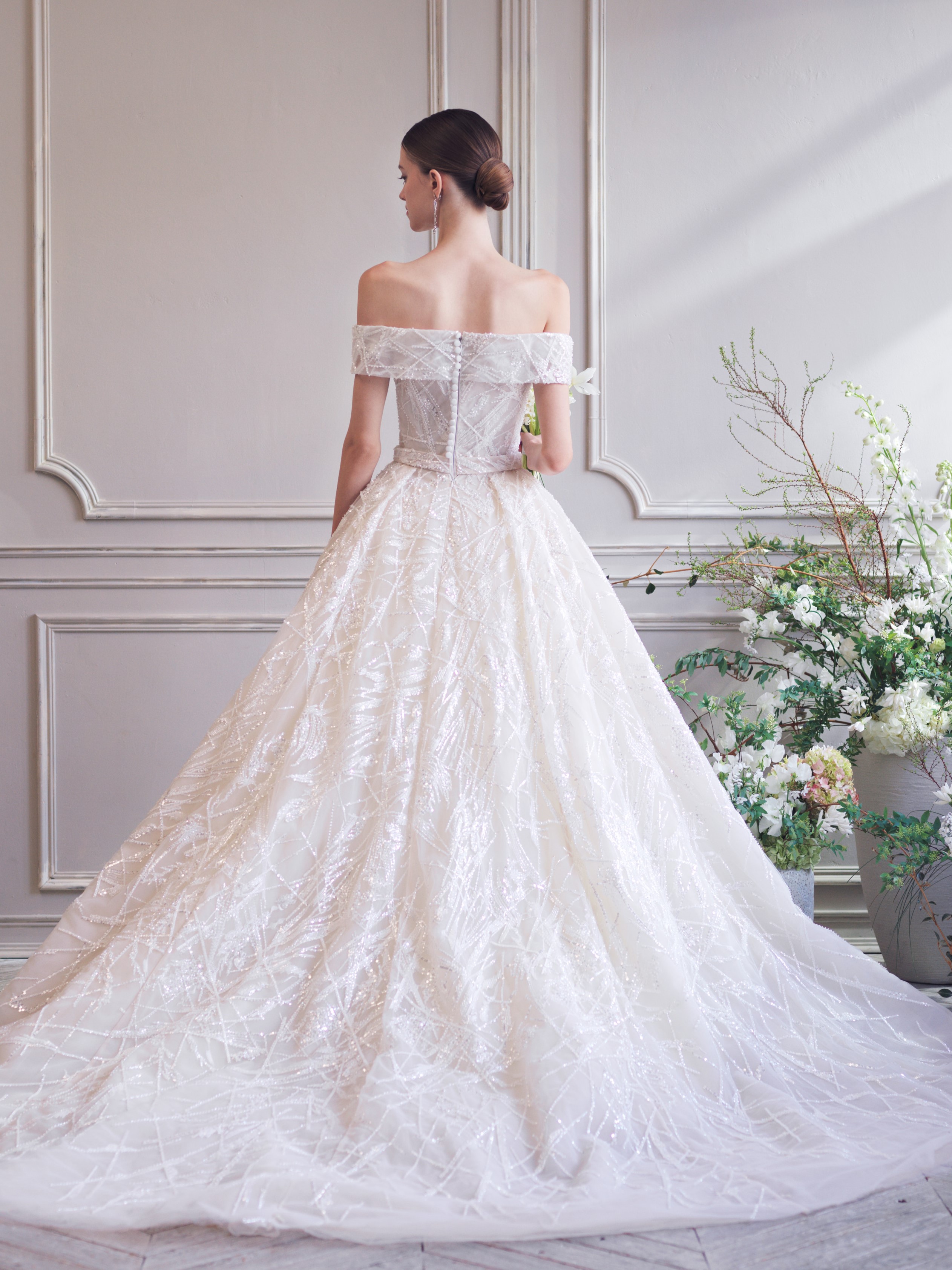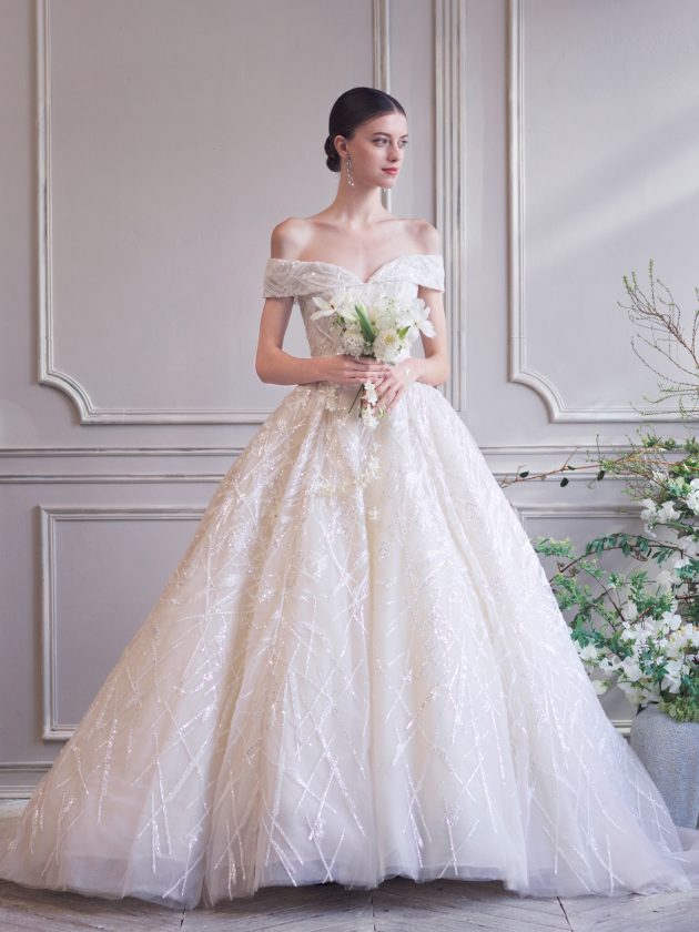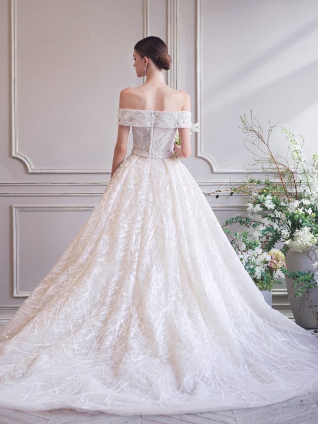 放射状に幾重にも重なったシルク糸の刺繍と、細やかなシークインの眩い輝きが、圧巻の存在感を放つ1着。 今回のコレクションのインスピレーション源である、モネの”睡蓮”に描かれているような太陽の光できらめく朝露や、水面に浮かぶ枝の様子が感じられます。 身体にフィットしたコンパクトなビスチェから、ハードチュールを仕込んだボリュームのあるスカートがふわりと広がり、どこから見てもドラマティックなシルエットを叶えます。 最高級の素材、精巧なクチュールテクニック、繊細かつ宝石を纏ったように華やかな中東ブランドらしさを感じる刺繍、どこをとっても最上級のラグジュアリーなドレスです。
