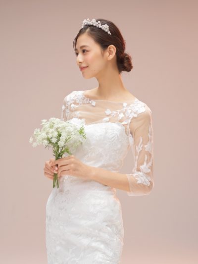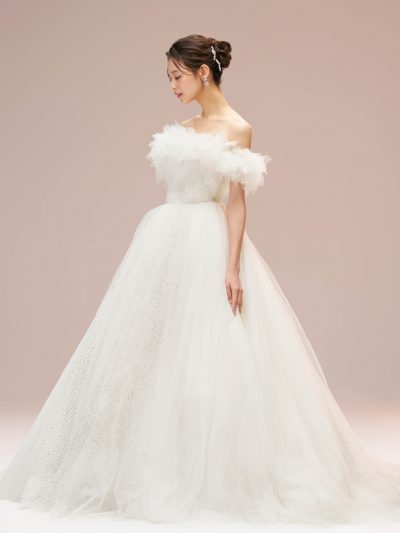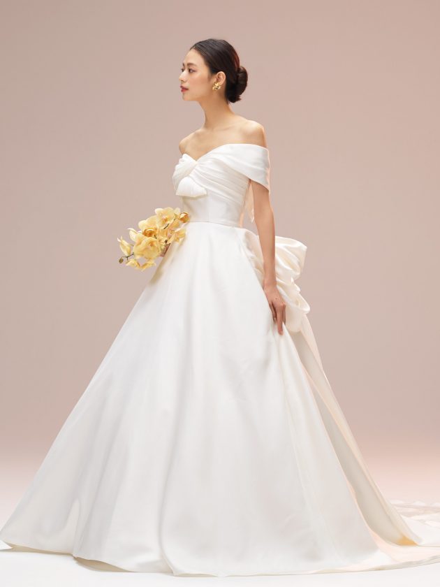 シンプルでありながらも、立体感のあるバストデザインやバックリボンなど、アイキャッチとなるポイントが散りばめられています。 後ろにかけて幅をなだらかに広げたオフショルダーや、絶妙に調整された胸元のデザインは、花嫁さまに安心感を与えます。 たっぷりとタックを寄せてふんわりと立体感を出したリボンは、程よいフェミニンさを演出するアクセントに。 どの時代でも愛されるクラシカルなウェディングドレスをお探しの花嫁さまに、ぜひお召しいただきたい一着です。