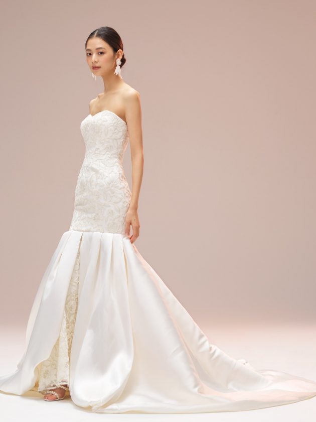 身体にフィットした美しいマーメイドラインをベースに、素材とオーバースカートがオリジナリティを感じさせる一着。 チュールの上に透かし模様のように浮かび上がるベロアテクスチャーのレース素材は、温かみのある女性らしさの中に芯のある美しさを演出します。 また、ゴールドの縁取りが、さらに華やかな印象に。 膝から広がるバルーンシルエットのユニークなスカートには、艶とハリのあるサテン素材を使用し、エレガントな印象を引き立てています。 歩くたびに美しい動きが生まれるよう、スカートのカーブにこだわった一着です。