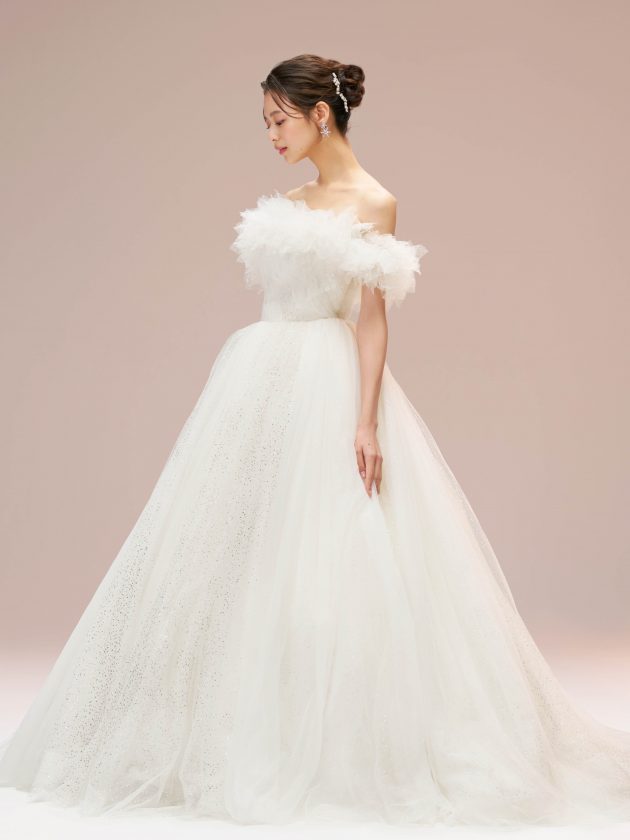 ドレス全体に散りばめられたまばゆい輝きと、たっぷりと重ねられたチュールスカートが、デザインのポイント。 ドレスをまとった瞬間に心がときめきます。 スタイルを美しく見せる絶妙な立ち上がりにこだわったフリルショルダーは、取り外しができることで2つのスタイルが楽しめます。 取り外すことで印象を大きく変えられるため、花嫁さまの理想のウェディングスタイルに合わせてお選びください。