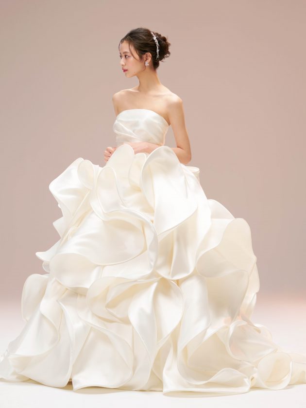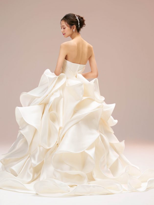 一度見たら忘れられないインパクトのあるドラマティックなビックボリュームドレス。 スカートは円形や半円のパーツにそれぞれワイヤーを入れて、一枚一枚花びらのような形状に。 スカート部分のドレープ表現は試行錯誤を重ね、何度も素材や方法を変えて完成しました。 すっきりとした身頃と、スカートへとつながる流れにこだわり、どこから見てもシルエットが美しいのも魅力の一つ。 少しローウエストしてウエストラインを強調させることで、ボリューム感もスタイルアップも叶えてくれます。