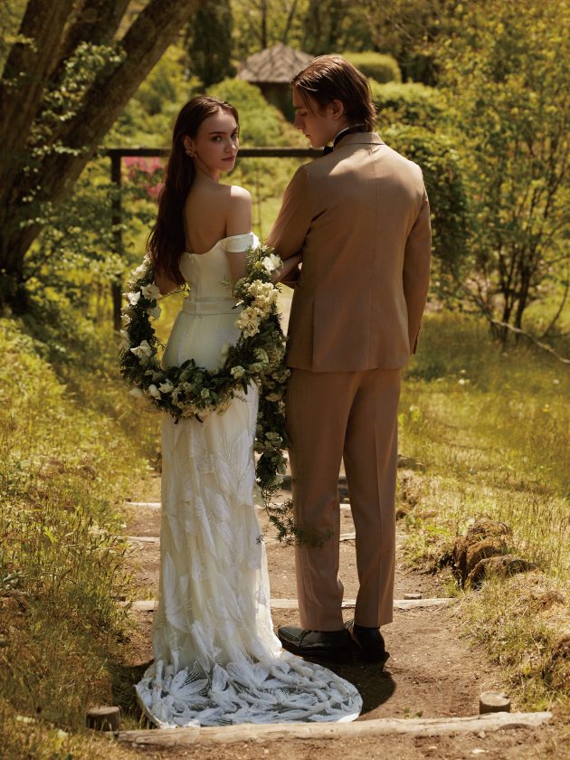 腕にそっと馴染むようなオフショルダーが優しい雰囲気をプラスし、身体に優しくフィットするストレッチサテンの生地は美しいマーメイドラインを実現します。 セットのオーバースカートはチュールに、シフォン、乳白色のスパンコールとビーズで刺繍を施したオリジナルのもの。お好きなコーディネートでお楽しみください。